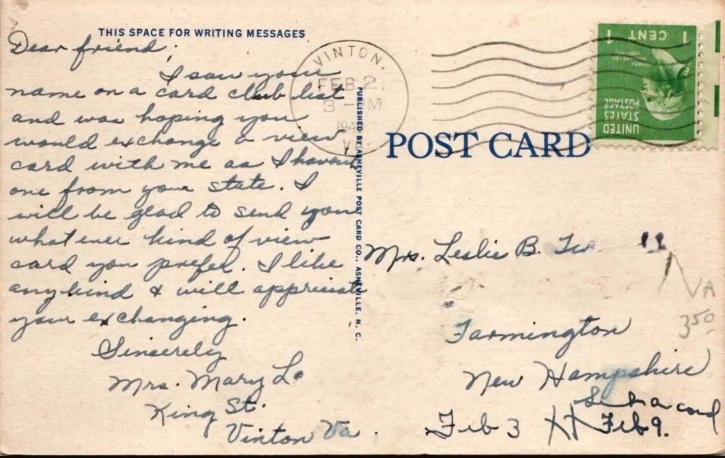 So here we are. This is the first postcard I picked out of the pack. Sent to a Mrs. Mary L. from Vinton, Virginia to Mrs. Leslie B[unfortunately can’t make out the rest of the surname] in New Hampshire. It is dated February 2nd, 1946.
