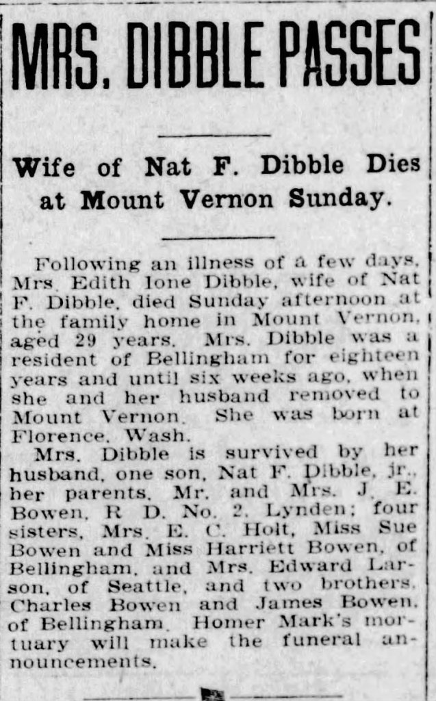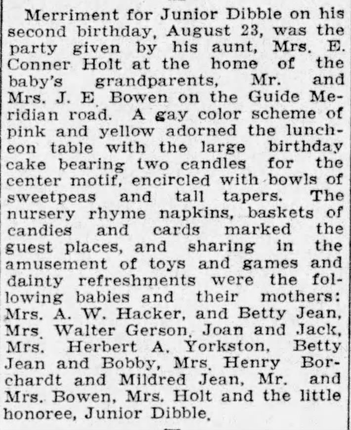 So from the census report and this newspaper clipping from the Bellingham Harold, I estimated Junior Dibble’s birth year to be 1924/1925. Also confirmed the information from the census as the newspaper article also mentions Junior’s aunt, Mrs. E. C. Holt Sr.,.
