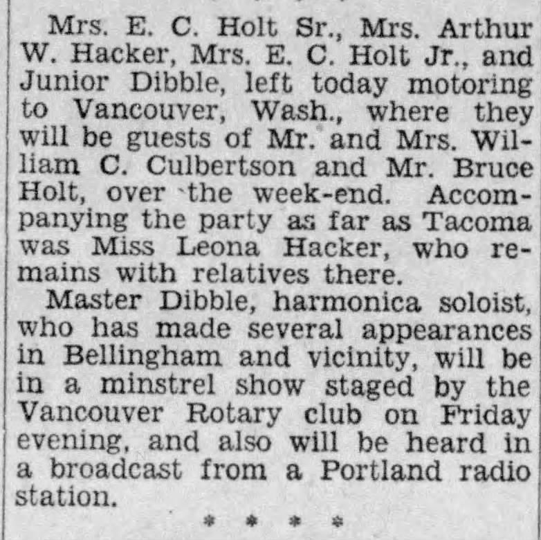Another article (not pictured) in The Bellingham Harold that was written about 10 years after his mom died, Junior started going by “Junior Dibble Holt”. In this article Junior is playing harmonica at a dinner after a wedding.