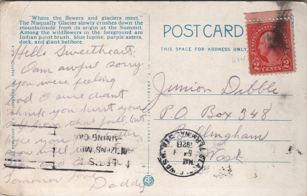 This postcard appears to have been sent from the Sea-Tac Terminal in Washington to Bellingham, Washington. It depicts the Nisqually Glacier in Rainier National Park, Washington.