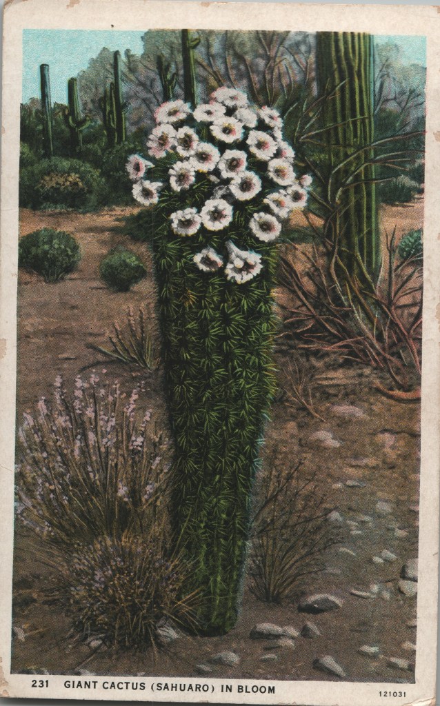Above is the front of the postcard. My guess is that it was sent from Arizona as the back of the postcard states that it was “published by Harry Herz, 754 E. Culver St., Phoenix, Arizona. According to Wikipedia, this cactus is native to the Sonoran Desert in Arizona. The blossom is the state wildflower of Arizona.