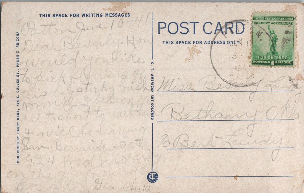Transcription: Patton June 10th 1941 (Beverly was likely born abt 1936-1937) Dear Beverly, how would you like to pick flowers off this big sticky(?) bush? Ronnie (very possibly Beverly’s younger brother) and I believe you are too short to reach them. I will be leaving San Bernadino at 9(?) Wednesday morning on the greyhound bus. – Lots of love, Grandma
