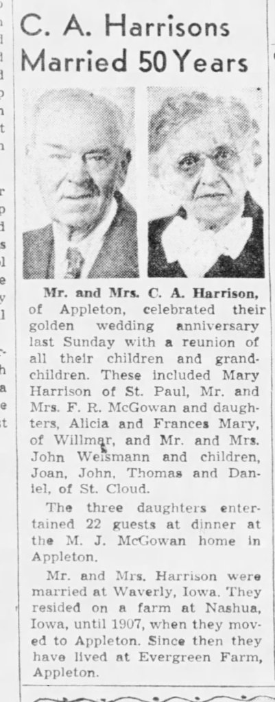 Anyway! The first thing I found was a anniversary announcement for Mr. and Mrs. C. A. Harrison. According to the Minneapolis Star Tribune dated March 17, 1946, they had been married for 50 years, their golden anniversary, and their three daughters entertained the many guests that came to celebrate.