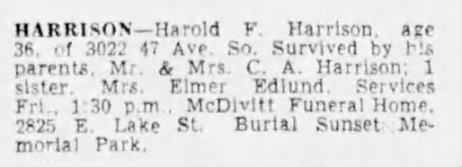 About 5 years later, in the Minneapolis Star dated 4/4/1951, I found an obituary for Harold F. Harrison, aged 36.