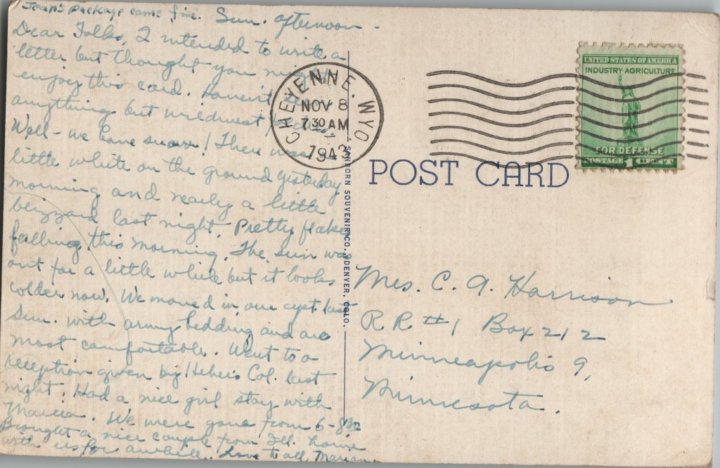 Dear folks, I wanted to write a letter but thought you might enjoy this card. Haven’t seen anything but ? and dust?? Well – we have snow! There was a little white on the ground yesterday morning and nearly a little blizzard last night. Pretty flakes falling this morning. The sun was out for a little while but it looks colder now. We moved in our ? last Sun with ? bedding and are most comfortable. What to a reception given by ? Col. last night; had a nice girl stay with Marcia. We were gone from 6-8:30. Brought a nice couple from Ill. home with us for a while. Love to all, Maryann?