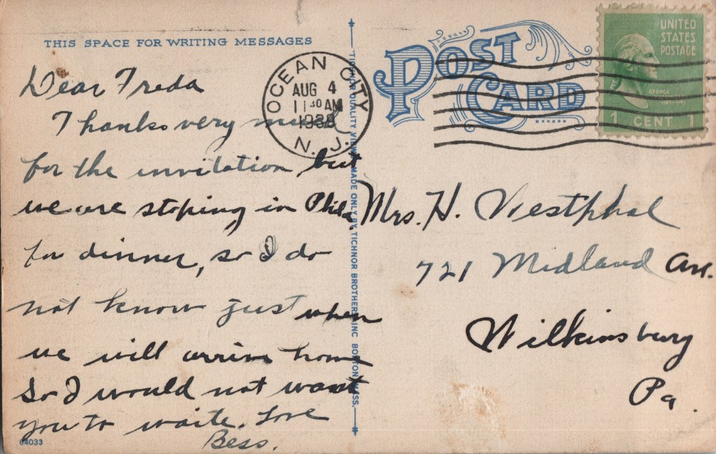 I couldn’t narrow down any Bess who would have sent this postcard from New Jersey, and there isn’t a whole lot of interesting information about Freda (Mrs. H. Westphal), the cards recipient. I found that B. Henry Westphal, Freda’s husband, was married before her. He married Freda in 1925 as a widower with a daughter.
