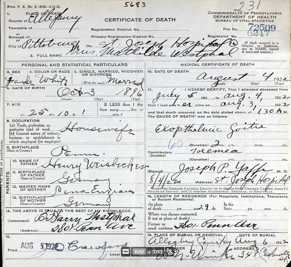 Mathilda (spelled Mathilde on the death certificate) “Martha” Weisbecker was born to Henry Weisbecker and Lena (?), both of Germany, on October 3rd, 1896. She died on August 4th, 1922. Her cause of death was exophthalmic goiter, which she appears to have dealt with for 2 years. The secondary case of death was toxemea (toxemia?).