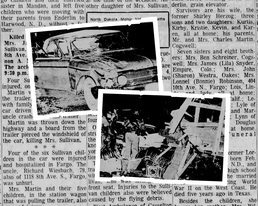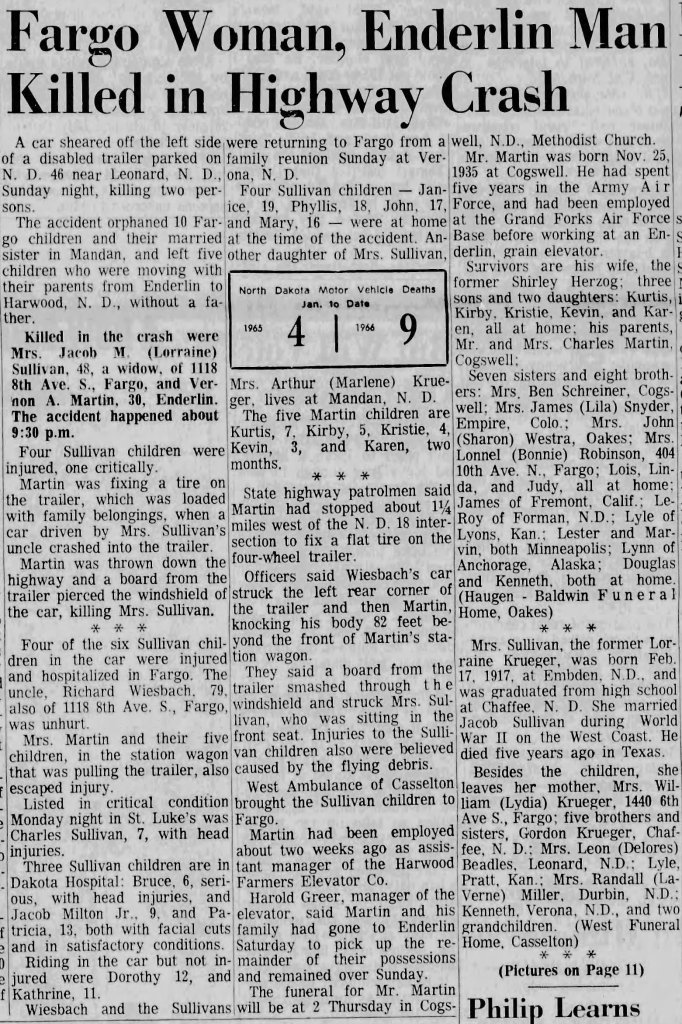 I remember hearing stories about how Vernon died, and now I have access to the news articles (maybe even the original clipping) to support it. Vernon had died on February 6th, 1966, when he was 30 years old. He had stopped and was changing a tire along side the road on State Highway #46, close to Leonard, North Dakota, when he was hit by another car. The car was totaled and the trailer it was pulling was destroyed. He died almost instantly after being thrown 82 feet past his station wagon.