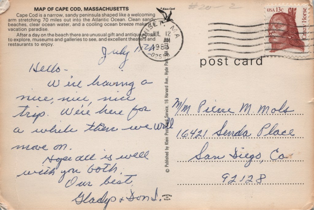 When looking up the recipients of the postcard, I came across a 1930 census report for Pierre M. Mols, and his wife, Freda. They were both 25 at the time. The census report also tells us that Pierre and his parents were all born in Holland. In 1930, he was working as a cameraman for film studios.