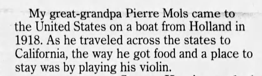 I plugged his information into newpapers.com and found an article in the Ventura County Star that asked kids where their ancestors were from and why they are proud of it. I found this from Pierre’s great-grandson, Cooper, who was in 4th grade at the time.