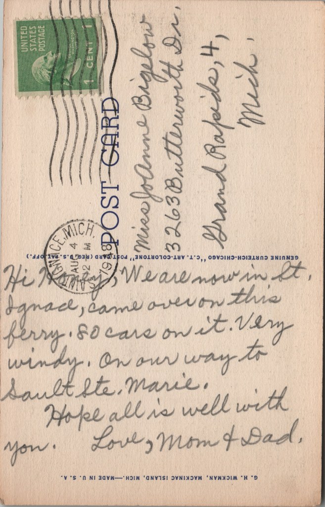 We are now in St. Ignace, came over on this ferry. 80 cars on it. Very windy. On our way to Saint Ignace Marie. Hope all is well with you.