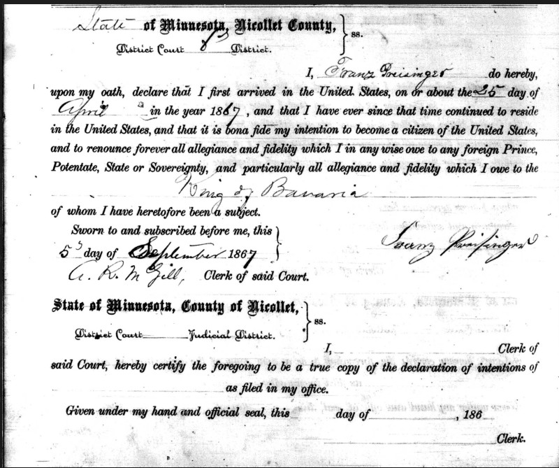 The earliest record I have that I can trace back with 100% certainty is the naturalization record for my 4th great-grandfather Wolfgang Preisinger in 1867.