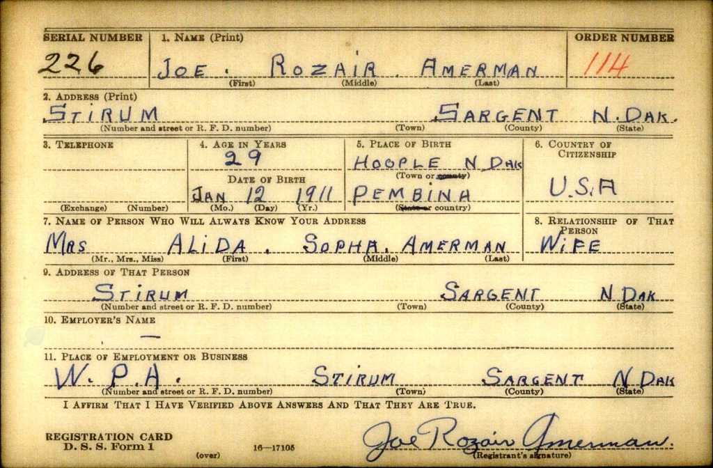 The first thing that stuck out to me when looking at his draft card was that he was signing an official government document as Joe Rozair Amerman instead of Rozair Joseph Amerman. The second thing that stuck out to me was the handwriting, assuming he was the one filling it out. I found the “S” to be pretty distinctive. He also wrote in all capitals, which I also do. I am skeptical, though. The signed name looks nothing like the printed information. A lot of the time print an cursive handwriting will have some similarities, but in this case I don’t think they do.