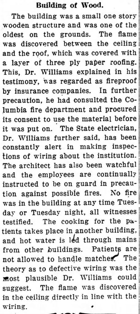 No theory of Origin of fire except possible defective wiring – two badly burned. Seventeen persons were burned to death when the eleventh was, a single-story wooden structure, at the State Hospital for the Insane, was destroyed by fire at 3 o’clock. Two other patients are in a precarious condition. Fifteen of the patients were burned to death within the four walls. Two died later in the day from burns. The ward was occupied by 45 patients. An inquest was held by Coroner Scott, when a thorough investigation as to the possible cause of the fire was made. From the testimony adduced, no theory was advanced as to the origin of the fire except possibly from defective insulation of the electric wiring. It was developed that all night employees were at their respective posts and that no delinquency of duty was attached to any one connected with the institution. The tragedy was regarded as wholly unavoidable and no blame could be place one anyone.